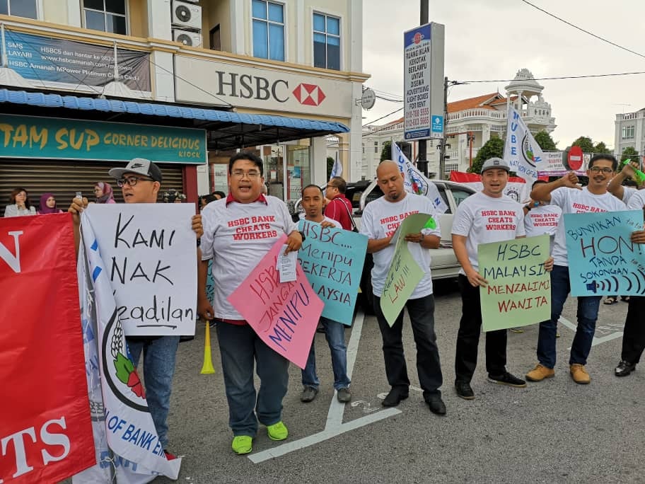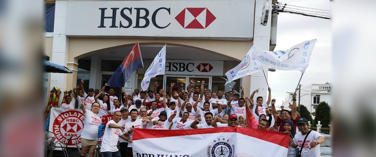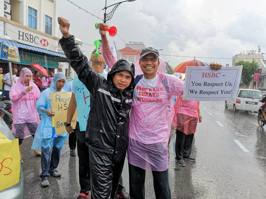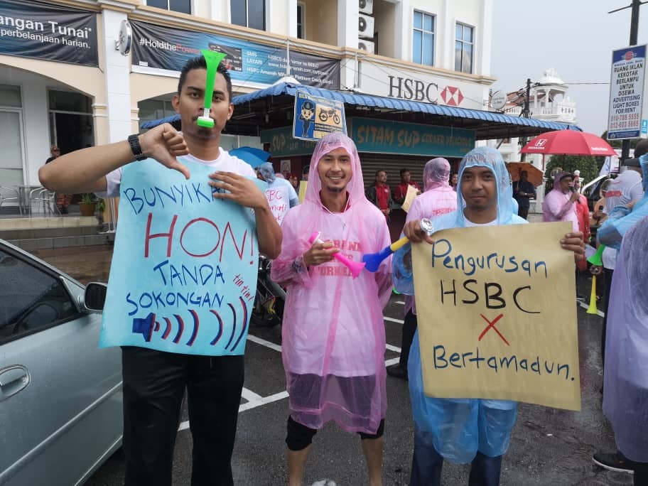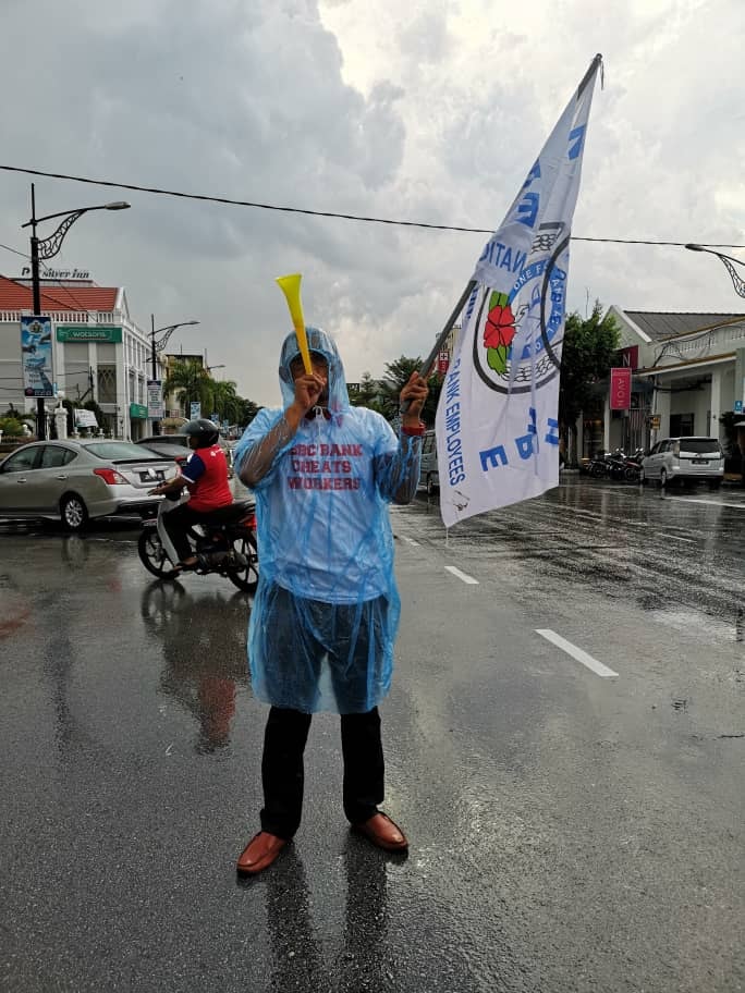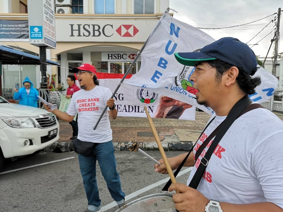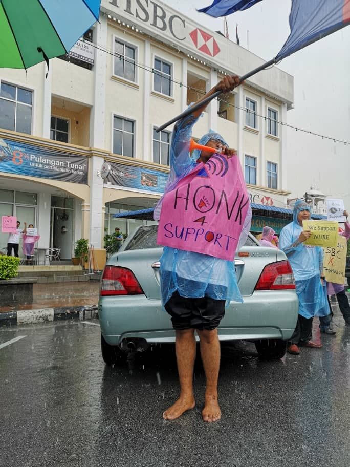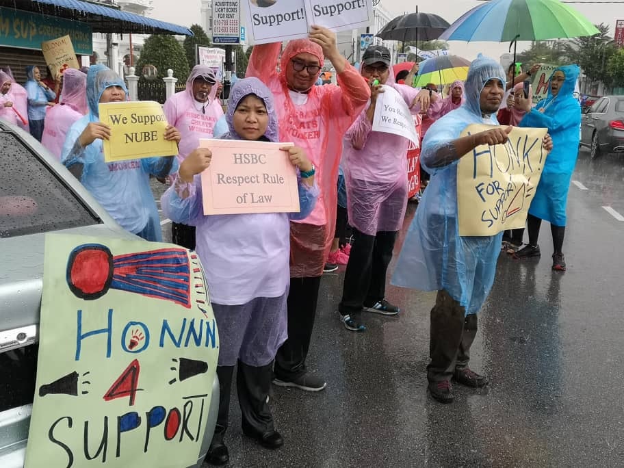 Batu Pahat, Johor 5hb April 2019.- Seramai 200 ahli ahli NUBE dibawah cuaca hujan ribut tetap turun padang berpiket dan tidak patah semangat menunjukan semangat solidariti dan perjuangan kepada pekerja- pekerja Bank HSBC yang ditindas oleh pengurusan HSBC yang angkuh dan tidak berperikemanusiaan terhadap pekerja wanita yang berpendapatan rendah.