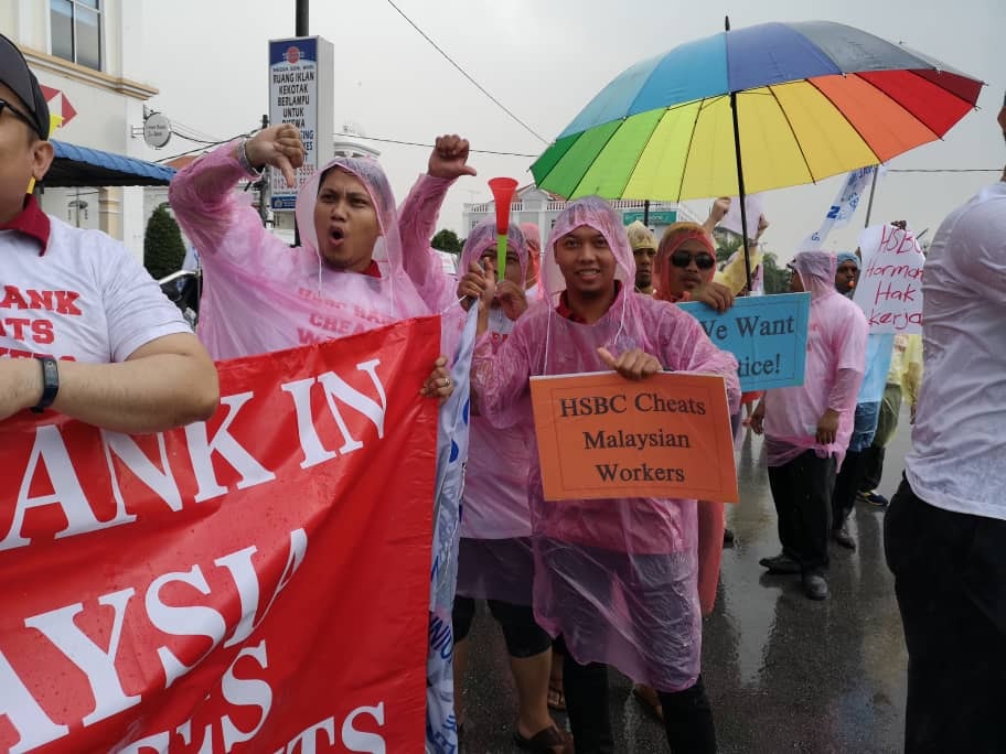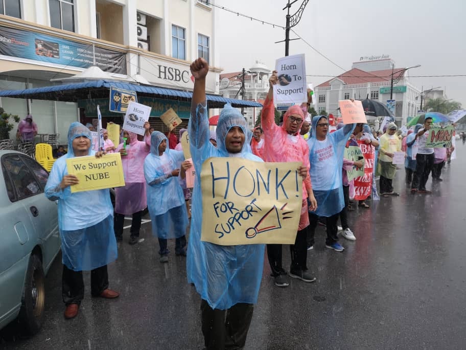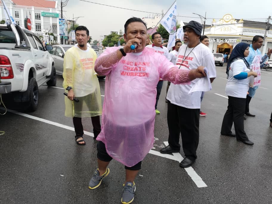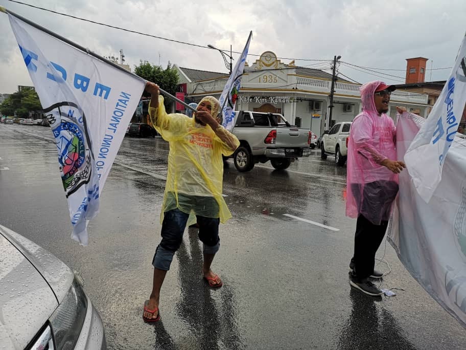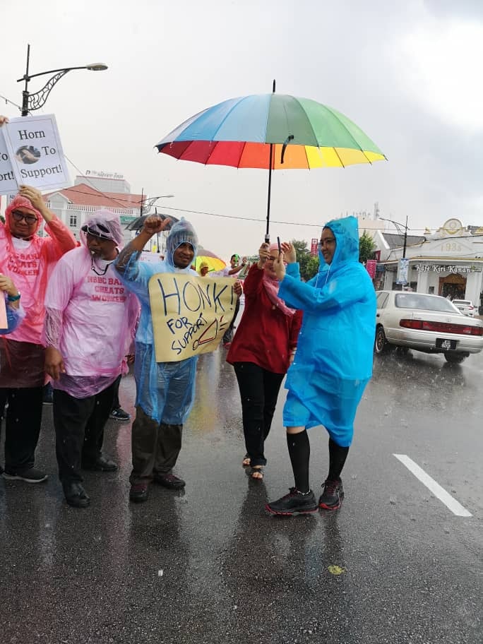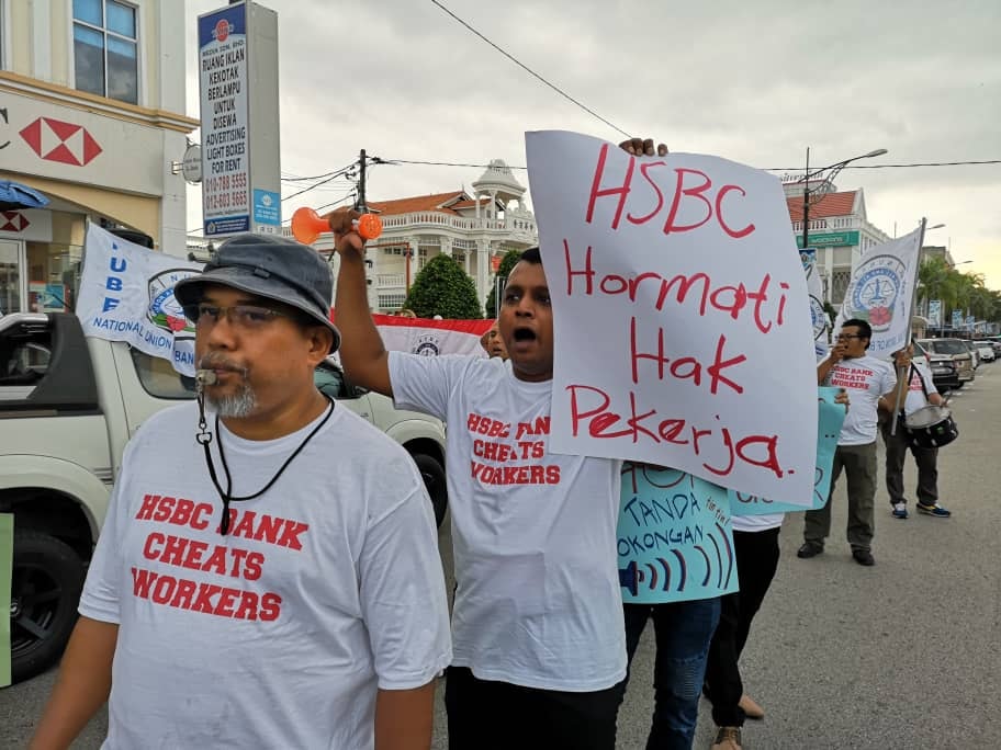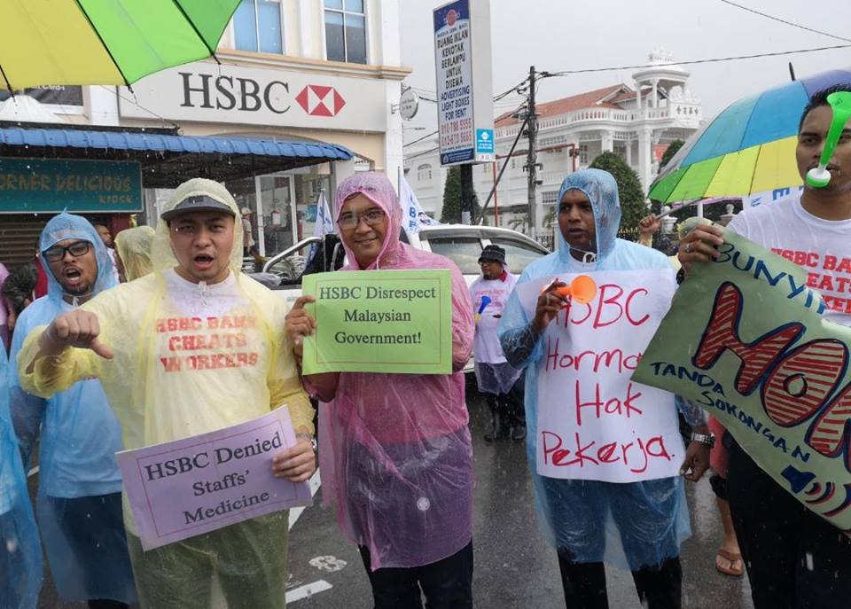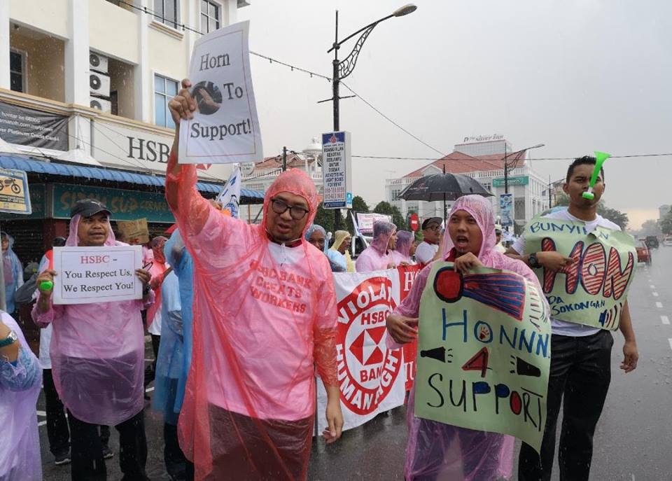 Batu Pahat, Johor 5hb April 2019.- Seramai 200 ahli ahli NUBE dibawah cuaca hujan ribut tetap turun padang berpiket dan tidak patah semangat menunjukan semangat solidariti dan perjuangan kepada pekerja- pekerja Bank HSBC yang ditindas oleh pengurusan HSBC yang angkuh dan tidak berperikemanusiaan terhadap pekerja wanita yang berpendapatan rendah.