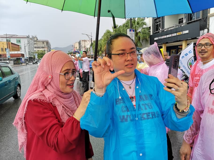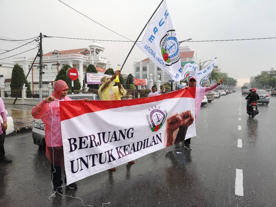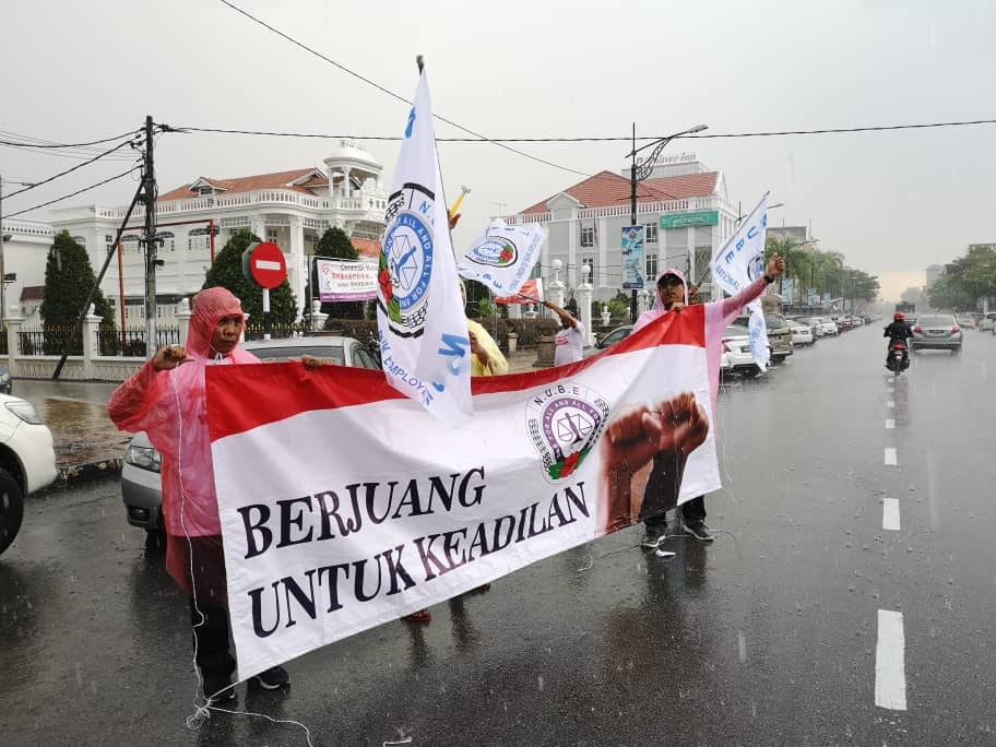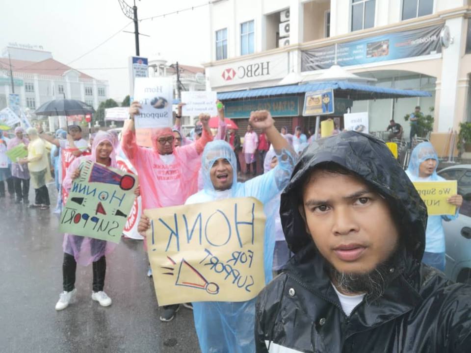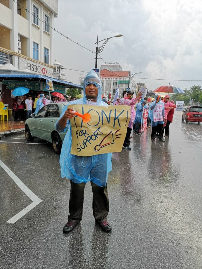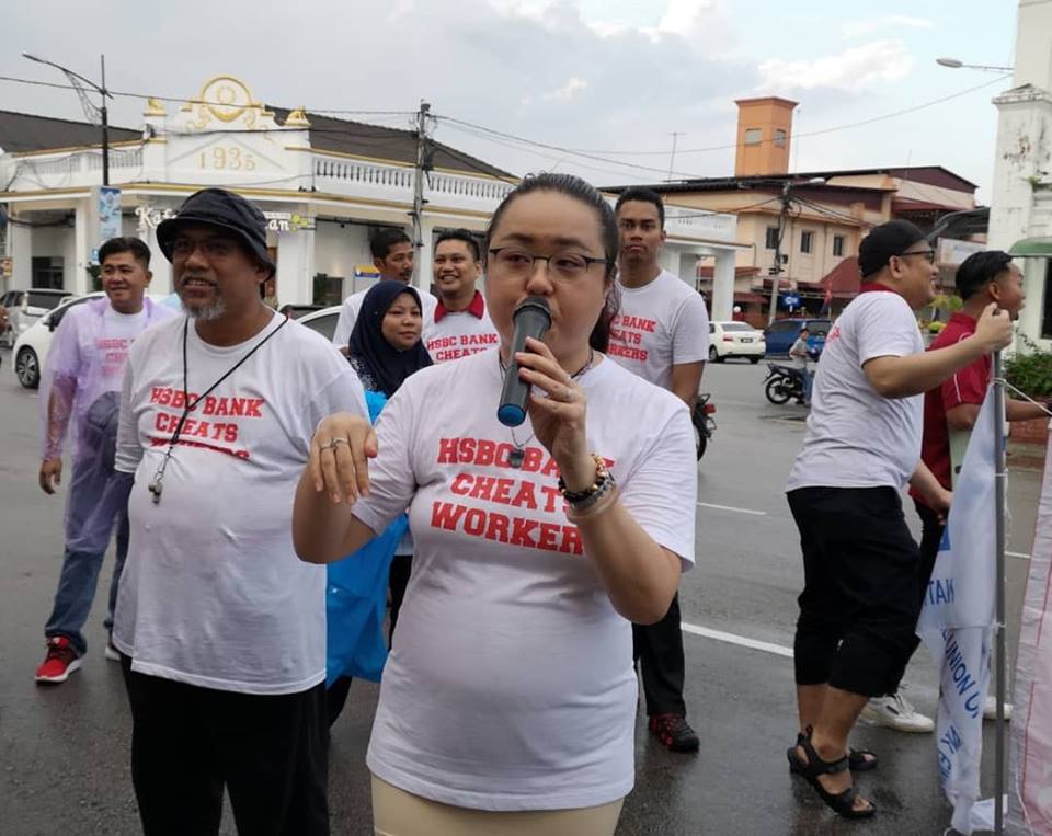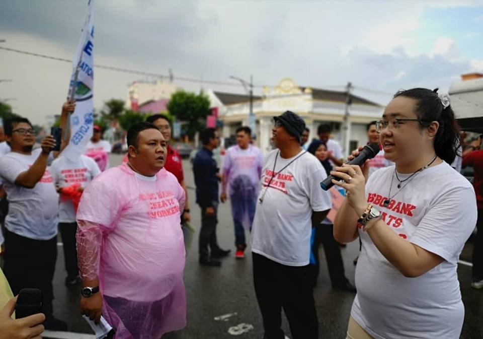 Batu Pahat, Johor 5hb April 2019.- Seramai 200 ahli ahli NUBE dibawah cuaca hujan ribut tetap turun padang berpiket dan tidak patah semangat menunjukan semangat solidariti dan perjuangan kepada pekerja- pekerja Bank HSBC yang ditindas oleh pengurusan HSBC yang angkuh dan tidak berperikemanusiaan terhadap pekerja wanita yang berpendapatan rendah.