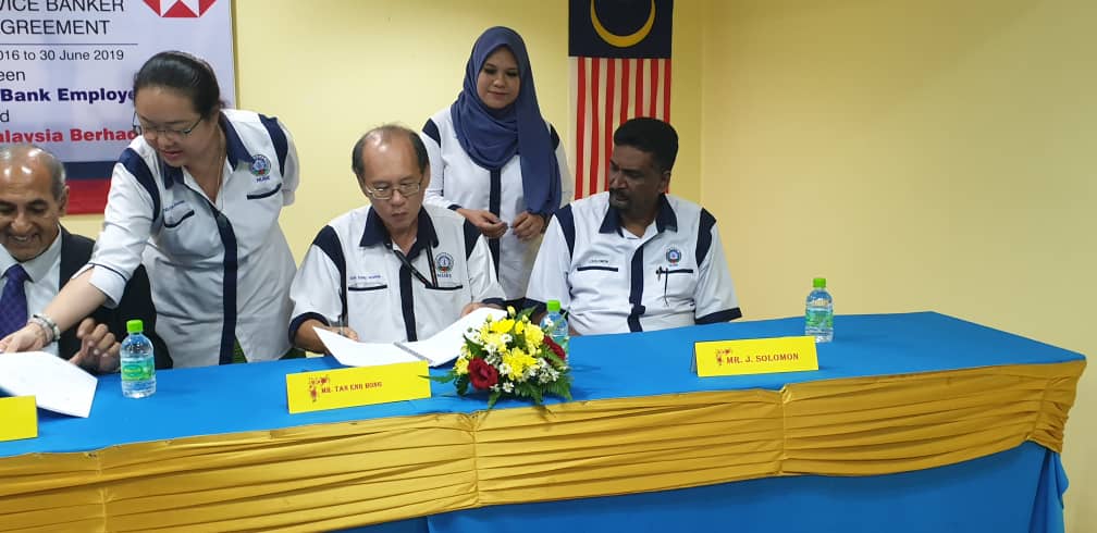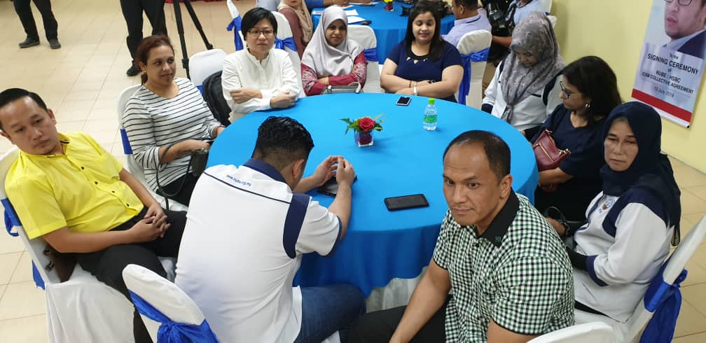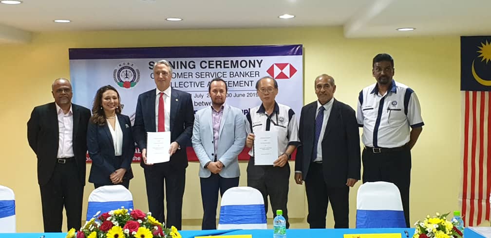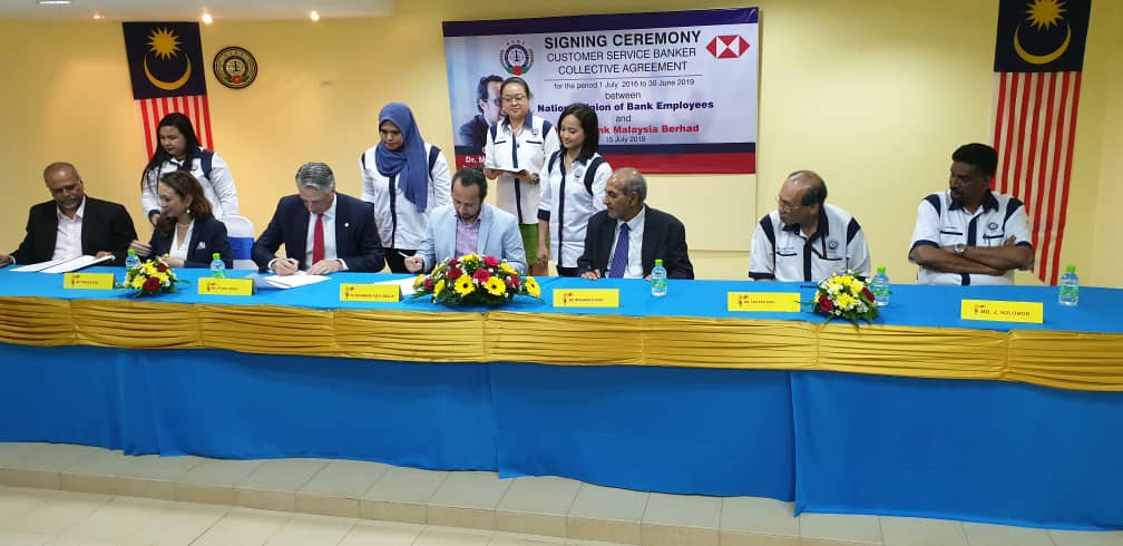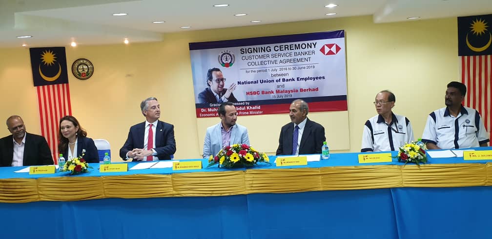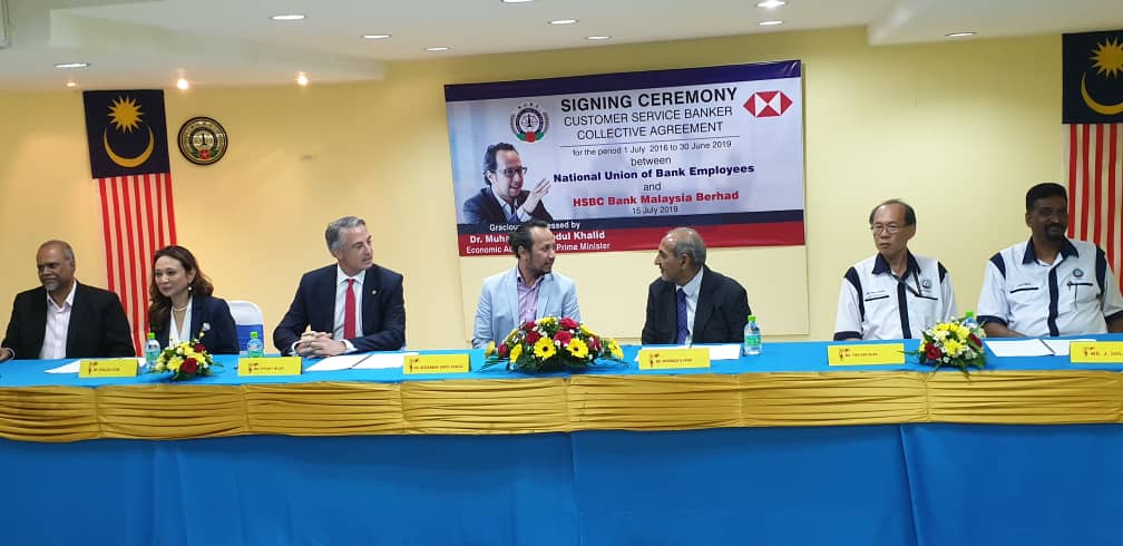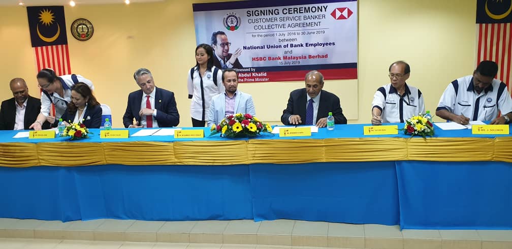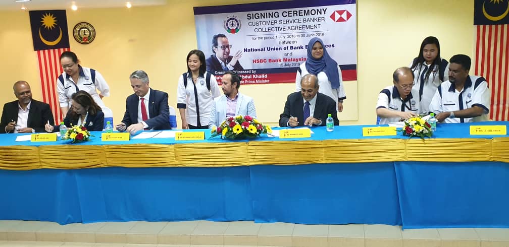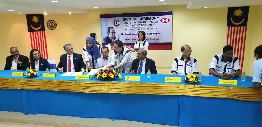 CA hari ini ditandatangani oleh Presiden NUBE Tan Eng Hong dan Setiausaha Agungnya J. Solomon manakala HSBC diwakili oleh Ketua Sumber Manusianya Norlida Azmi dan Alan Sunil Netto selaku Ketua Perhubungan Perusahaan HSBC,