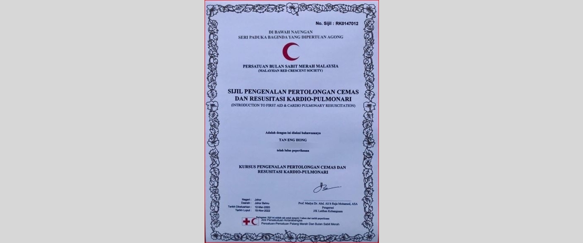 Beliau telah dianugerahkan dengan sijil kemahiran dalam pertolongan cemas dan seperti yang diperuntukkan di bawah Garis Panduan Jabatan Keselamatan dan Kesihatan Pekerja (JKKP) dalam Pertolongan Cemas di Tempat Kerja (Edisi ke-2), Saudara Tan akan dapat memberikan Pertolongan Cemas di tempat kerja jika berlaku kecemasan dengan peralatan minimum sehingga pegawai perubatan tiba.