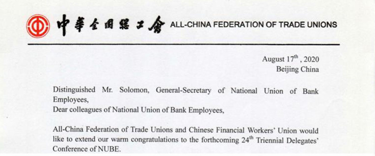 ACFTU also extended its well wishes for NUBE Triennial Delegates Conference.