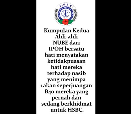 Kumpulan Kedua Ahli-ahli NUBE dari IPOH bersatu hati menyatakan ketidakpuasan hati mereka terhadap nasib yang menimpa rakan seperjuangan B40 mereka yang pernah dan sedang berkhidmat untuk HSBC.