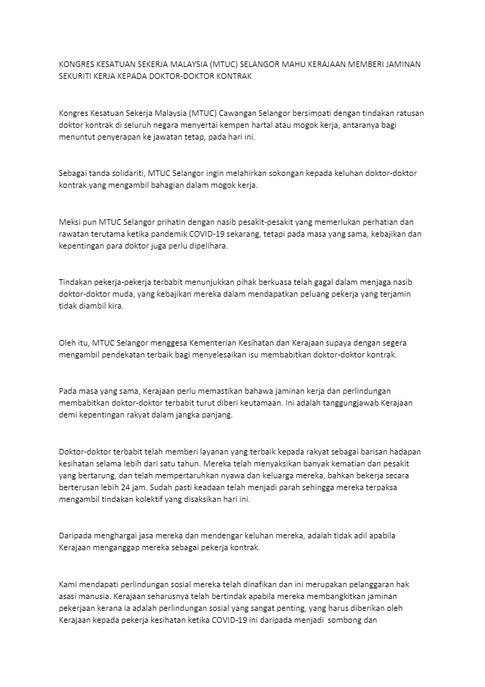 KUALA LUMPUR – Kongres Kesatuan Sekerja Malaysia (MTUC) Cawangan Selangor menggesa Kementerian Kesihatan dan Kerajaan supaya dengan segera mengambil pendekatan terbaik bagi menyelesaikan isu membabitkan doktor-doktor kontrak.