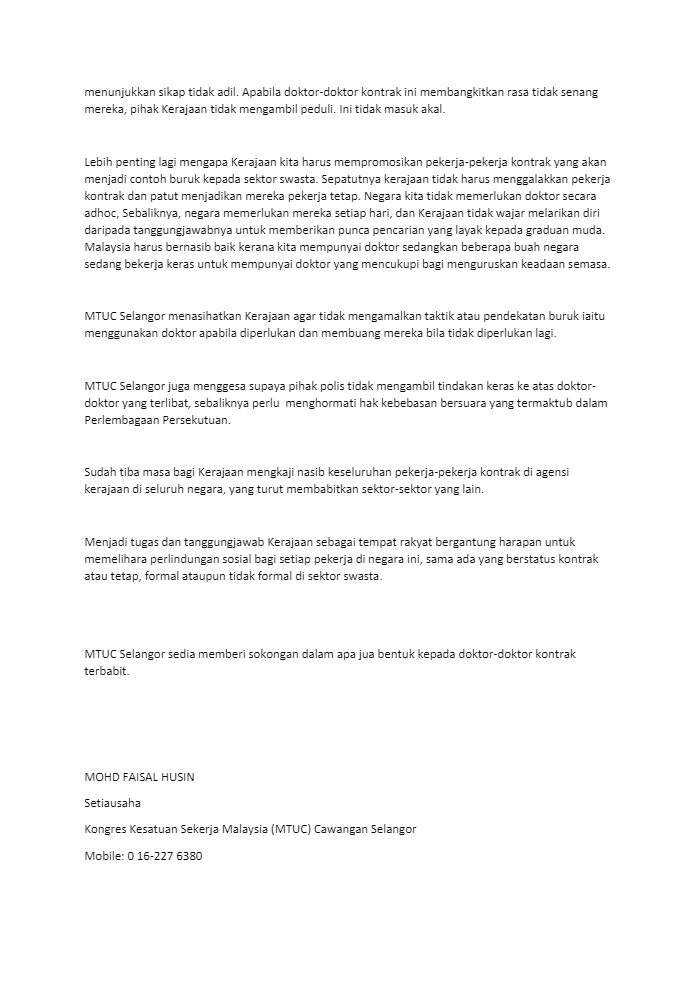 MTUC Selangor meminta Kerajaan agar tidak mengamalkan taktik atau pendekatan buruk iaitu menggunakan doktor apabila diperlukan dan membuang mereka bila tidak diperlukan lagi.