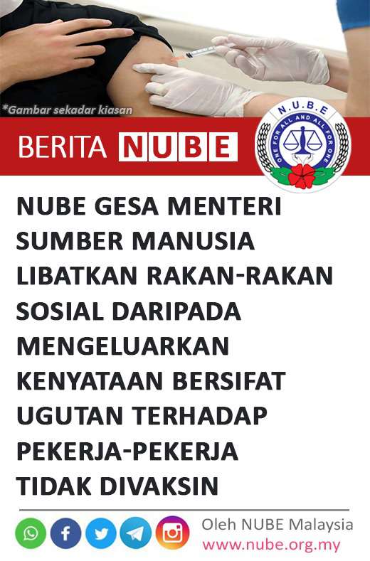 NUBE bimbang kerana kenyataan tidak cermat oleh Menteri Sumber Manusia boleh menyebabkan diskriminasi yang tidak adil terhadap pekerja yang tidak mengambil vaksin, pemecatan tidak adil pekerja-pekerja yang tidak divaksin dan diskriminasi oleh majikan dalam proses pengambilan pekerja.
