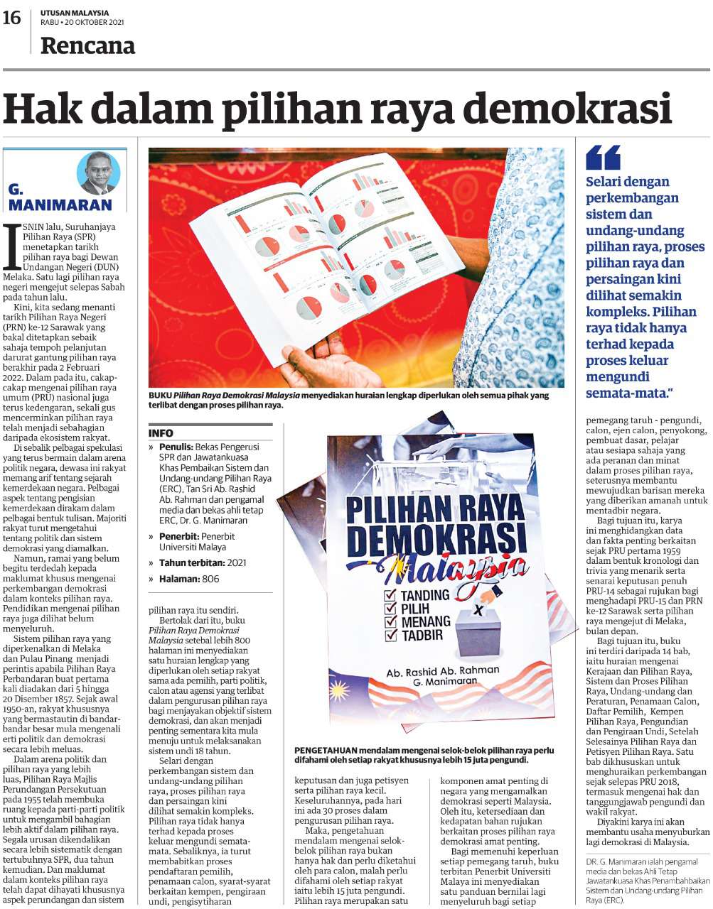 Berikut adalah kupasan umum mengenai buku "Pilihan Raya Demokrasi Malaysia: Tanding, Pilih, Menang & Tadbir", yang disiarkan oleh Utusan Malaysia, hari ini.