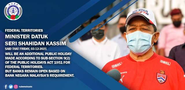 Oleh yang demikian, harap maklum bahawa ahli-ahli NUBE di kawasan Wilayah Persekutuan yang diwajipkan untuk bertugas esok, hari Jumaat, 3-Dis-2021 perlu membuat tuntutan upah kerja lebih masa (overtime) pada kadar hari cuti umum seperti yang termaktub di dalam Perjanjian Kolektif MCBA/NUBE selepas bertugas esok.