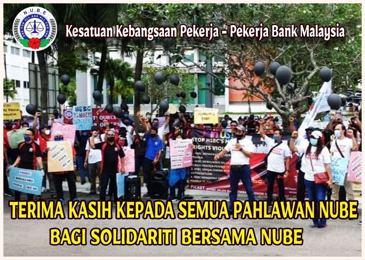 Bagi pihak NUBE, saya ingin merakamkan setinggi-tinggi penghargaan kepada semua anggota KELUARGA NUBE yang telah mengharungi pandemik Covid-19 dengan bergerak dari seluruh negara ke HSBC Bank Malaysia di Johor Bahru untuk menyuarakan solidariti demi ahli-ahli NUBE di HSBC.