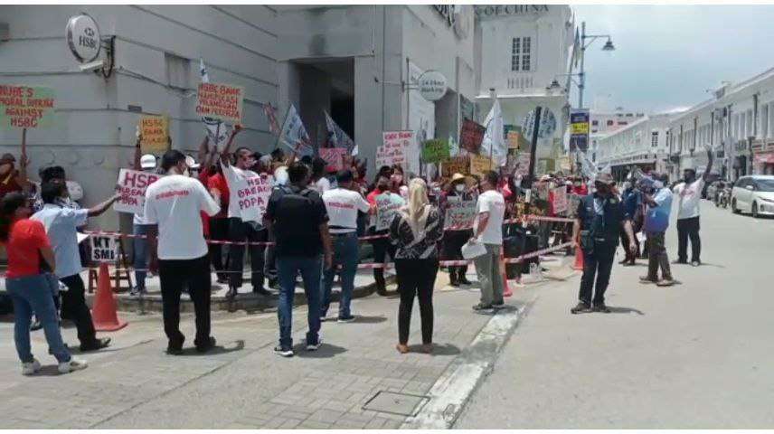 Lagu bersemangat para peserta menzahirkan "terima kasih NUBE" di akhir piket kebangsaan fasa kedua memprotes HSBC Bank Malaysia, yang berlangsung di pekarangan HSBC Bank Malaysia Cawangan Pulau Pinang, di No 1, Downing Street, George Town, Pulau Pinang semalam ... menggambarkan solidariti padu dalam kalangan ahli dan pemimpin kita...