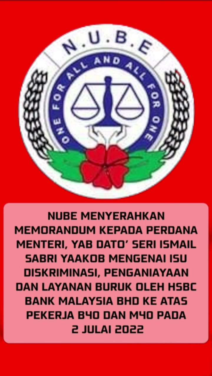 NUBE percaya bahawa campur tangan YAB Perdana Menteri akan melindungi hak pekerja B40 dan M40, daripada penindasan, penganiayaan dan diskriminasi HSBC Bank Malaysia Bhd.