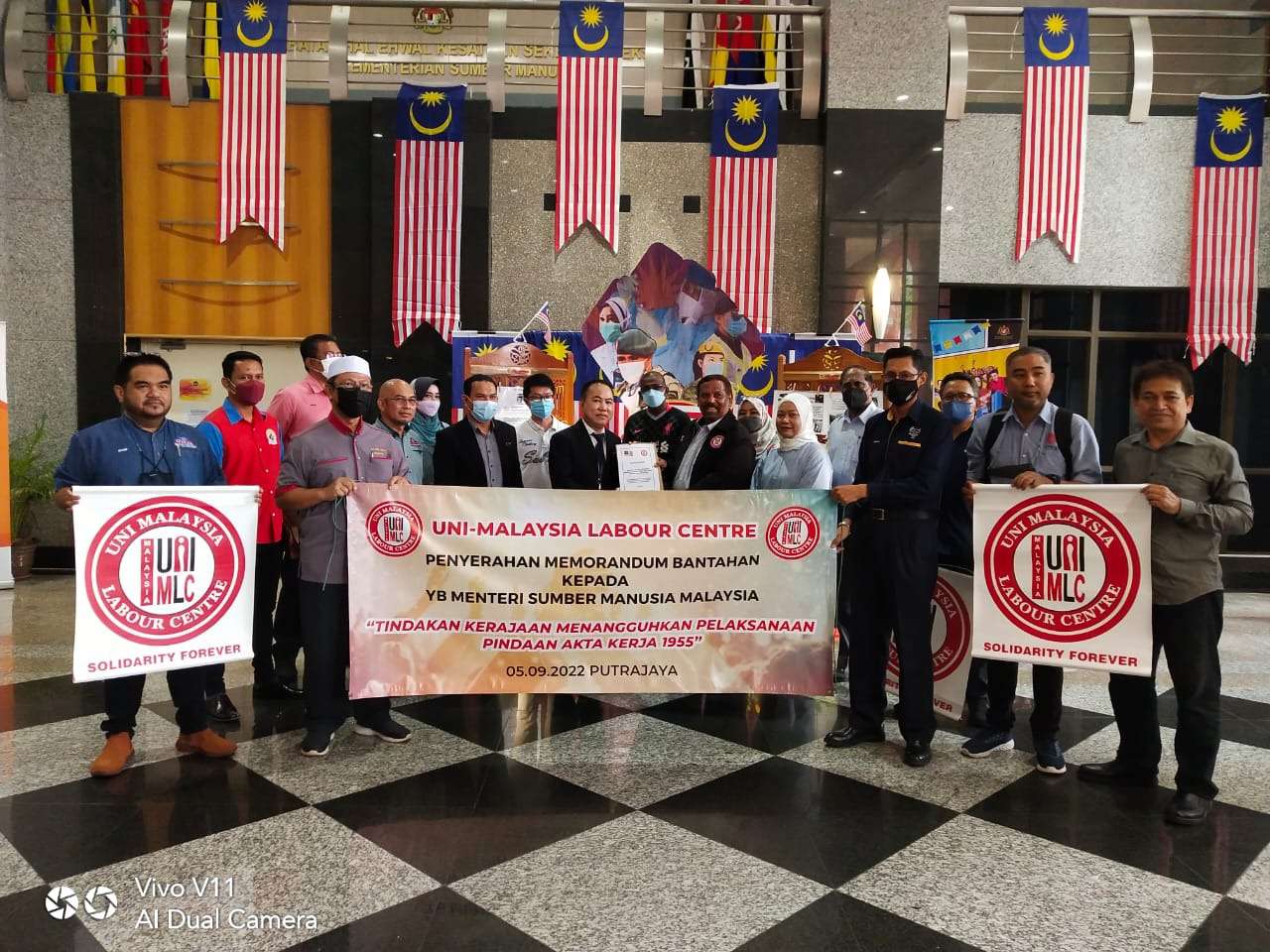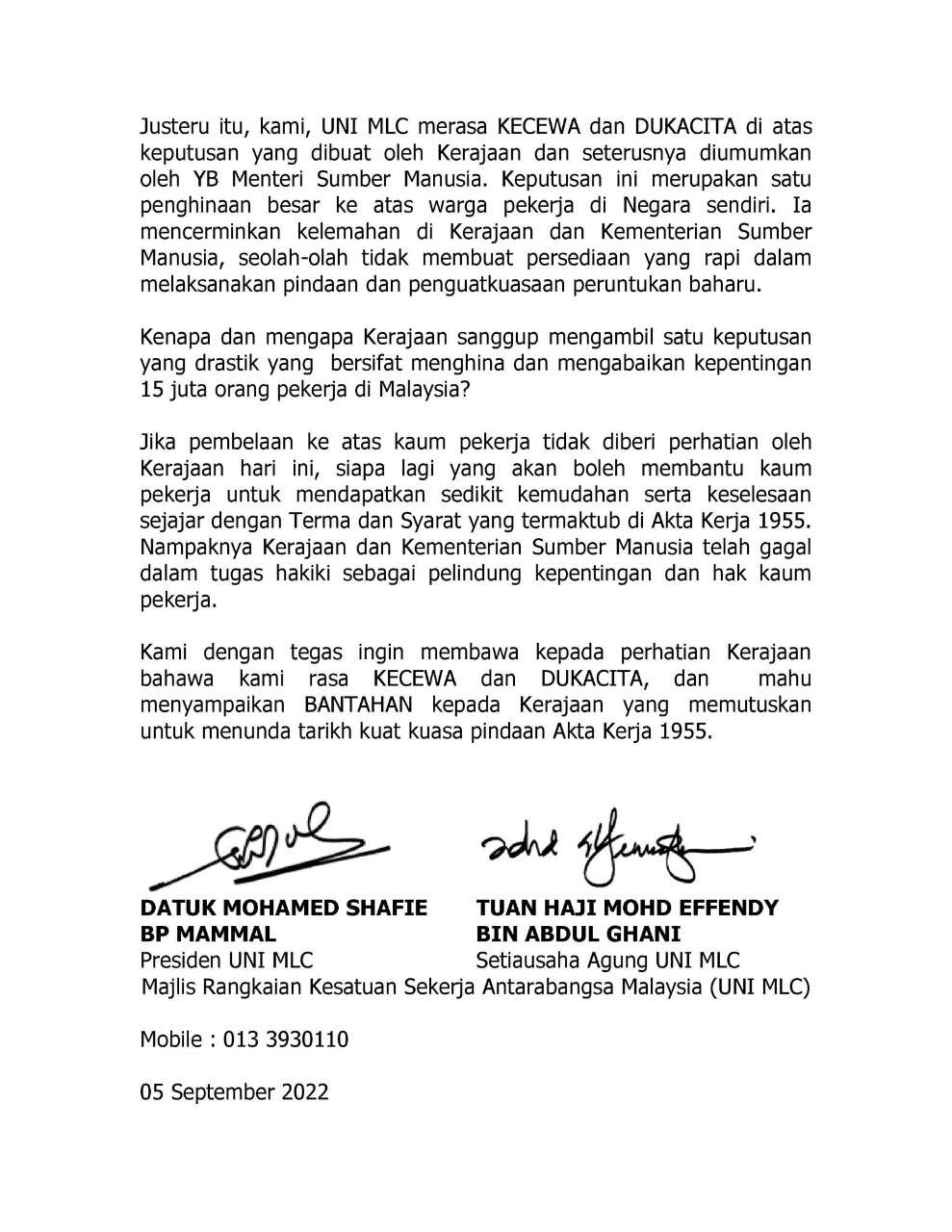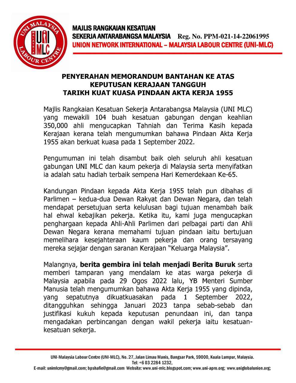 Memorandum Bantahan Penangguhan Tarikh Kuat Kuasa Pindaan Akta Kerja 1955 telah diserahkan kepada Y.Bhg. Tuan Kolony Gunting Head Unit of International Affairs at Govt of Malaysia