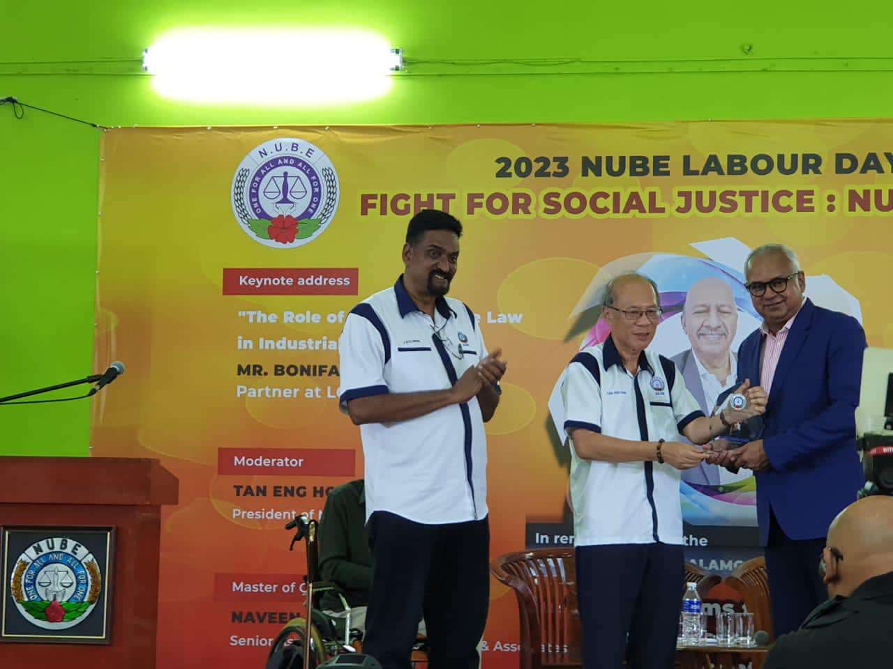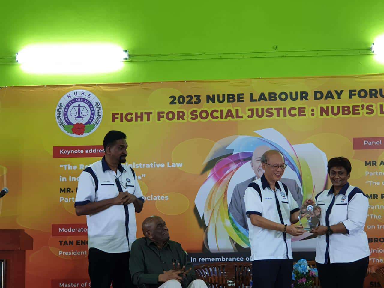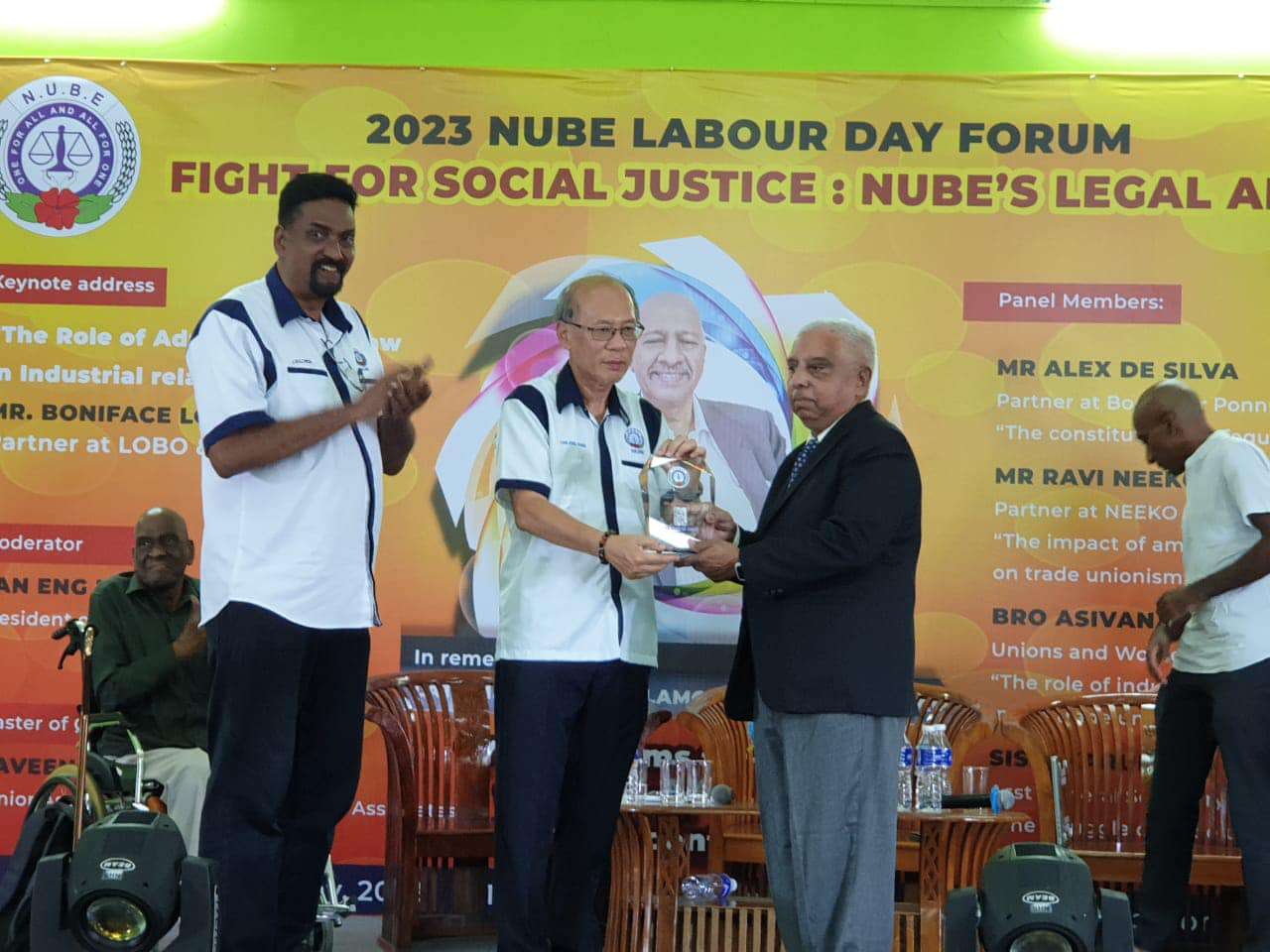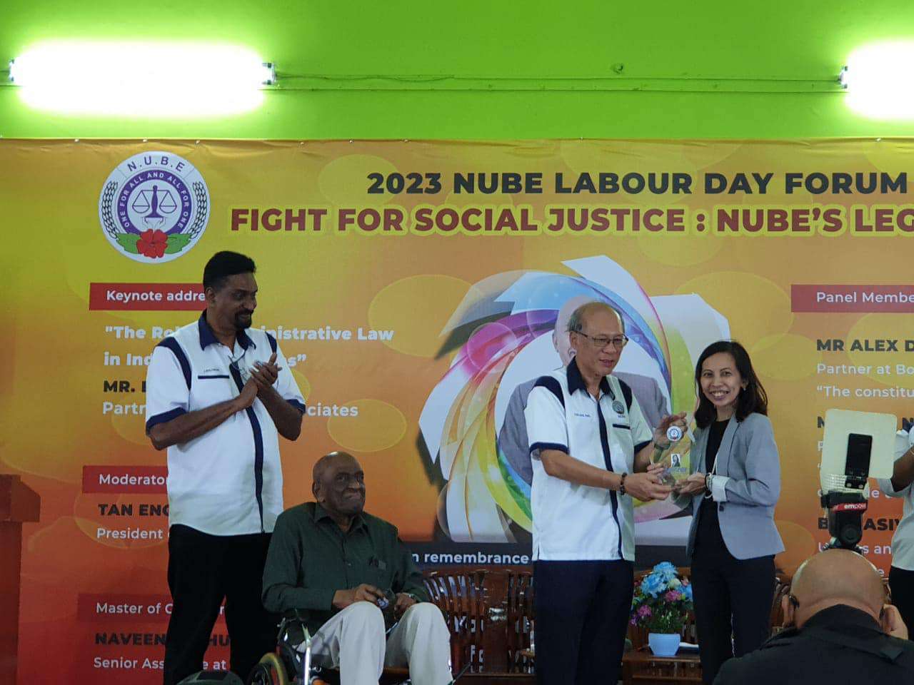 Sdr Michael Tan, Presiden NUBE yang bertindak sebagai moderator telah menyampaikan plak tanda penghargaan kepada penceramah ucaptama dan ahli-ahli panel. Dua orang peguam yang turut mewakili NUBE dan menang dalam kes-kes yang dibawa turut dihargai.