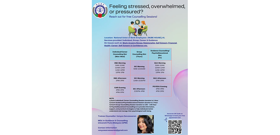 Bagi mereka yang ingin menjalani kehidupan yang lebih baik, kami menjemput anda untuk sertai dan mengambil peluang ini untuk sesi percuma bersama Kaunselor Pelatih dalaman NUBE - Cik Vanyza Sarveswaran.