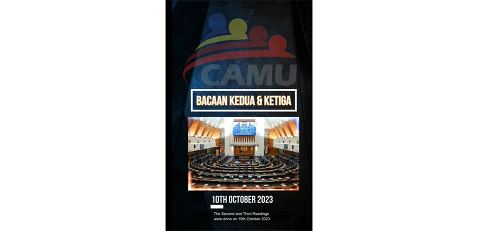 CAMU akan meneruskan kempen membantah Kepelbagaian Kesatuan Sekerja di satu tempat kerja dan kuasa lebar luas KP JHEKS yang akan terus mengawal dan mengongkong gerakan kesatuan sekerja di Malaysia di dalam pindaan RUU Akta Kesatuan Sekerja (Pindaan) 2023.