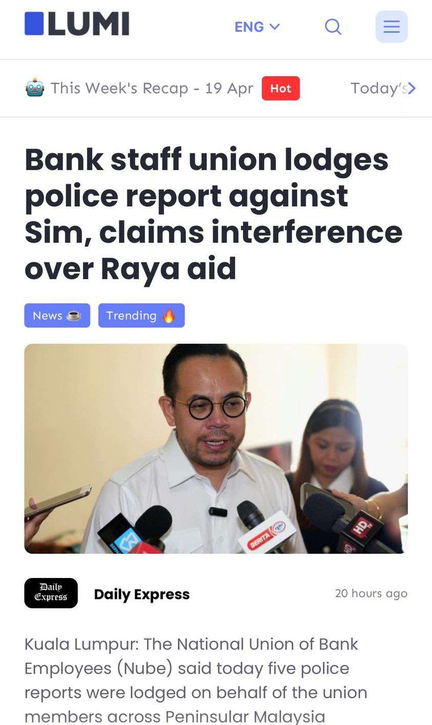 NUBE membuat laporan polis terhadap Sim, dakwa campur tangan terhadap Bantuan Raya lapor The Daily Express.